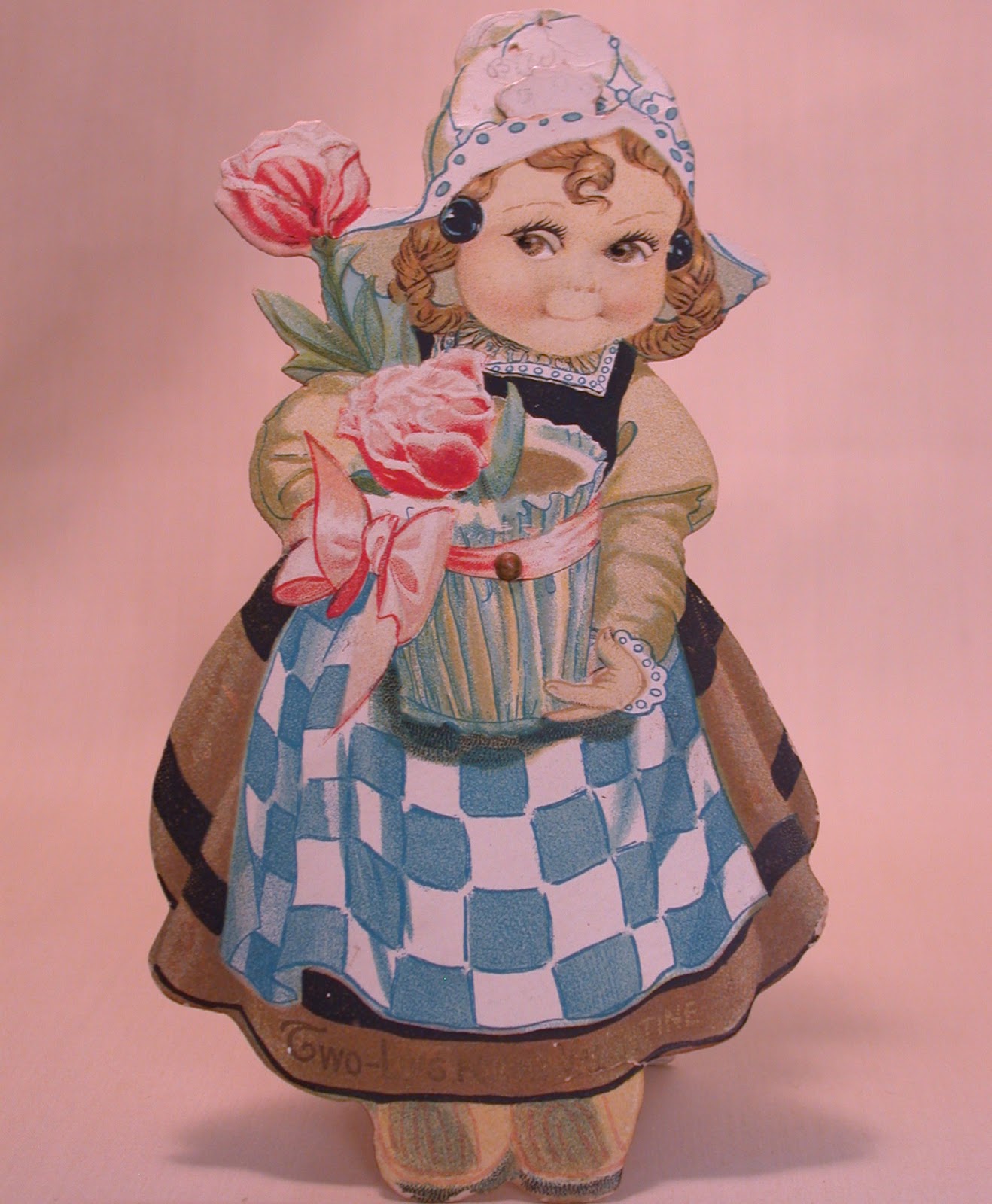 The McLoughlin Brothers, a London-based company (1848-1950) that also had a New York City office, popularized the heavy, sometimes riveted, valentine cards that could be used as home decor. The layers, attached onto thick backing board, were parchment or celluloid or a mix of the two. They were often adhered in a way to fold and ruffle or puff out, thus enhancing the 3-d effect created by the layering frequently used in the cards.